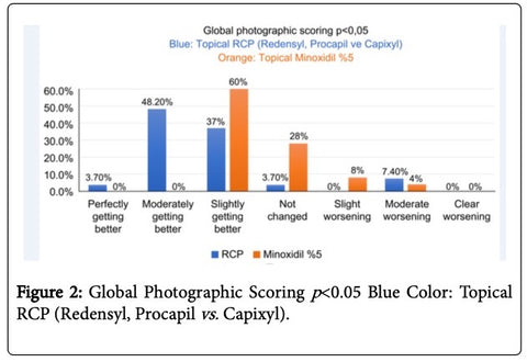 A recent published study compared RCP (Redensyl + Capixyl + Procapil) to a minoxidil 5% preparation. The research evaluation showed significantly better recovery in the group treated with RCP than in the group that received minoxidil treatment: minoxidil group 25.5% vs. RCP group 64.7%.
